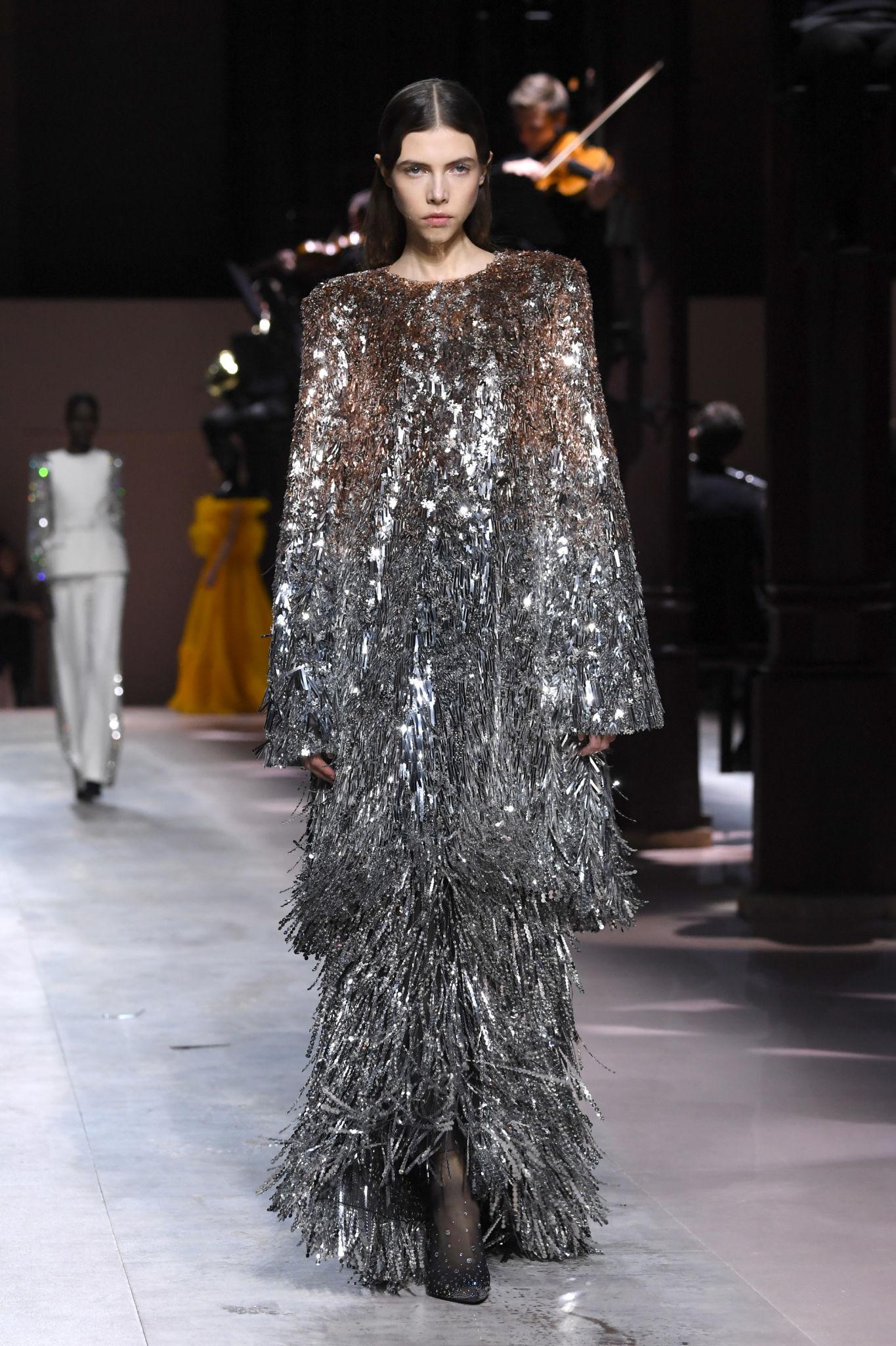 Junto a la sastrería, Burton presentó vestidos de noche adornados con flecos que aportaron movimiento y dramatismo a la propuesta. Estas piezas contrastaron con la precisión de los trajes, generando un diálogo entre la rigidez del tailoring y la fluidez de los textiles.